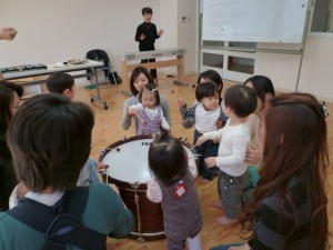 音楽に合わせて行進したり、スキンシップ遊びをしたり、大きな太鼓をたたいたり、きれいな音色に耳を済ませたりと音を楽しみました。